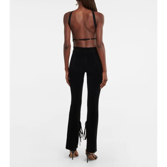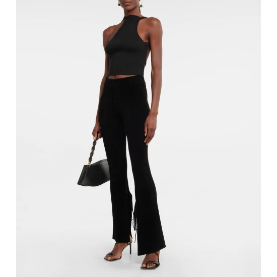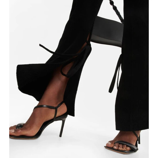 Featuring slits at the side, fastened with ties that wrap around the legs, the Chenille pants from Jacquemus have a unique design. They’re made from a black cotton blend ribbed knit and have a flared flit.