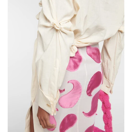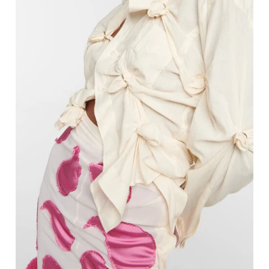 Made from pure cotton voile, Jacquemus’ La Chemise Lupo top has a cropped asymmetric fit defined by knots fixed with gold metal rings. It features mother-of-pearl buttons and long sleeves with engraved metal cufflinks.