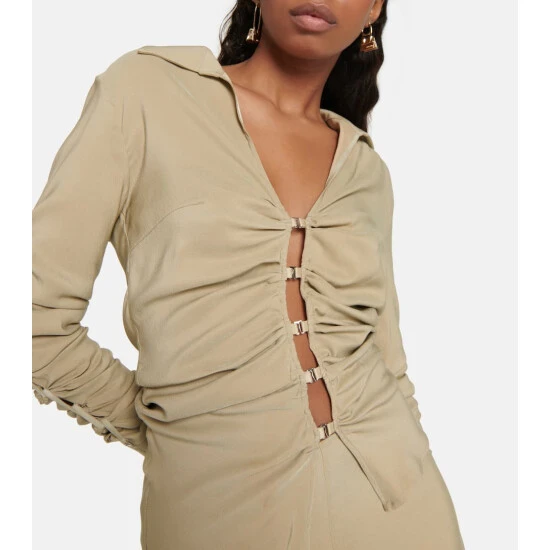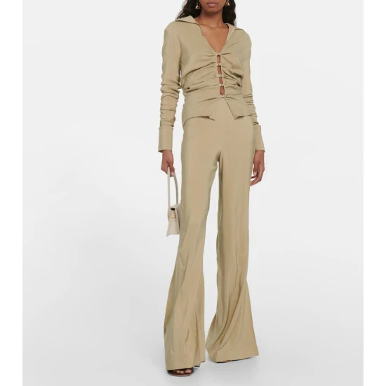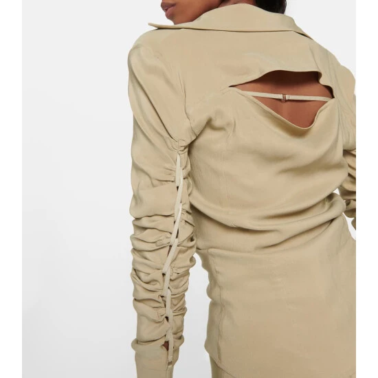 Jacquemus gives the classic shirt a playful and alluring twist with the La Chemise Soffio style. It features hook fastenings typically used for bras, gathered detailing throughout, and elastics interlaced in the sleeves.