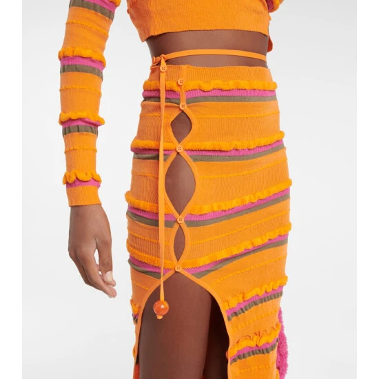 Jacquemus’ La Jupe Maille Concha style puts a twist on the standard midi skirt with an asymmetric fit. The textured style boasts a bright striped motif, waist strap, and side slit with button detailing.