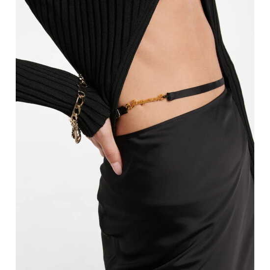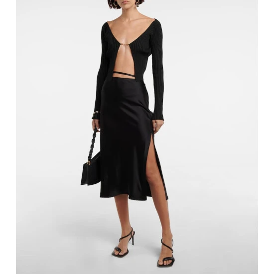 The La Jupe Notte midi skirt from Jacquemus will be your new favorite wardrobe staple. The high-waist style has an alluring strap extending from the waist with a gold-tone logo charm and a side slit.