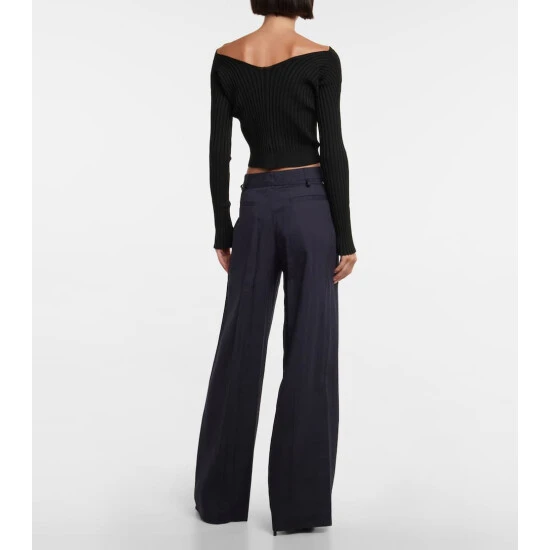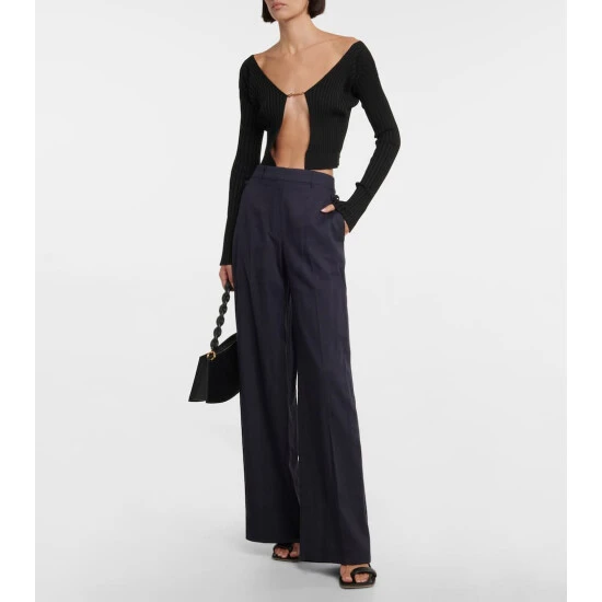 Bring some allure to your everyday edit with La Maille PralΓΉ Longue cardigan from Jacquemus. The ribbed-knit style in black features a plunging neckline held together by a dainty gold-tone logo charm.