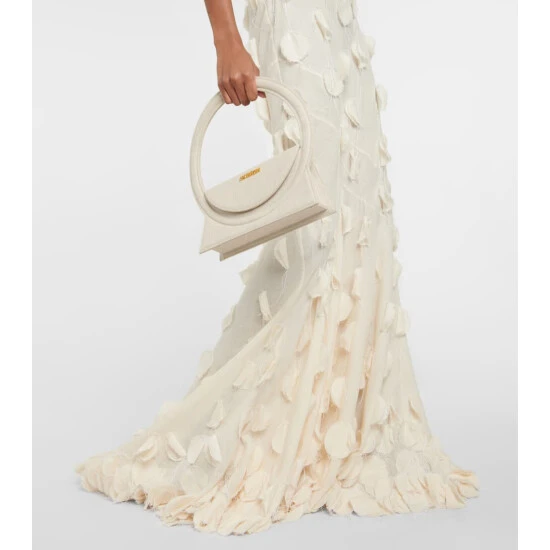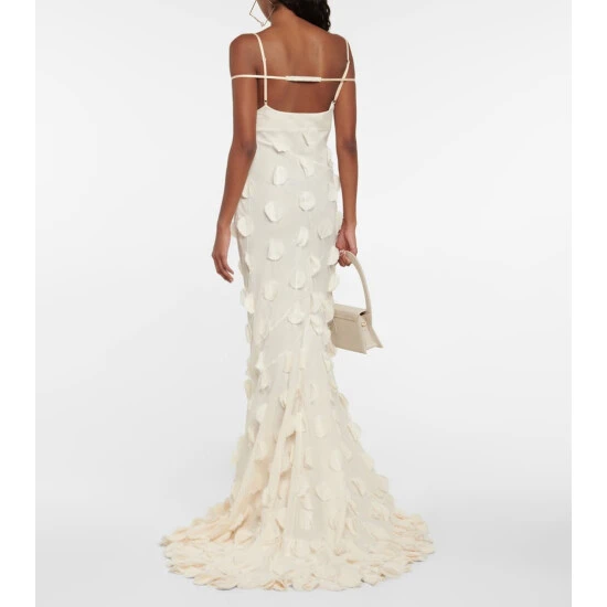 The La Robe Draggiu gown is beautifully crafted from cotton and features hand-embroidered dot appliqués with raw edges and loose threads. In typical Jacquemus fashion, it highlights the female form with an off-shoulder neckline and thin, crossing straps.