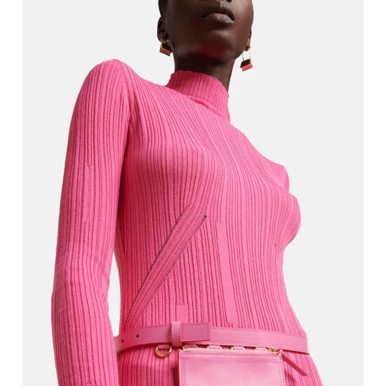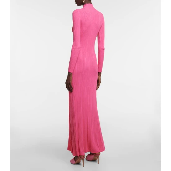 The La Robe Lenzuolo maxi dress from Jacquemus is a streamlined silhouette made from a slinky ribbed-knit. It has a mockneck and openwork detailing beneath the bust.