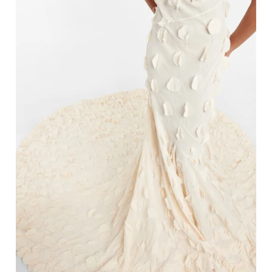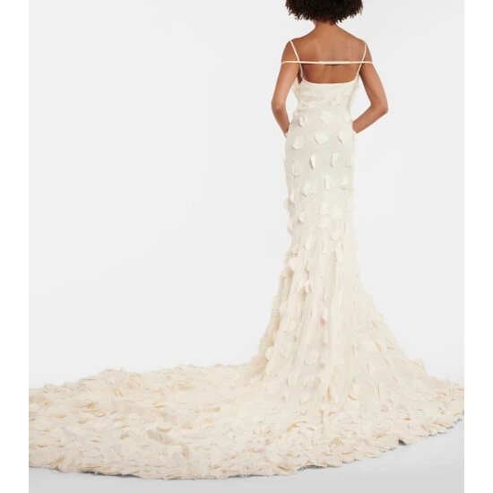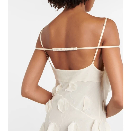 The La Robe Pois gown is beautifully crafted from cotton and features hand-embroidered dot appliqués with raw edges and loose threads. In typical Jacquemus fashion, it highlights the female form with doubled straps that cross in the back and a paneled mermaid hem and train.