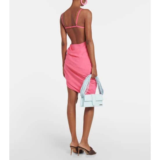 The La Robe Saudade dress is a mini-length take on a standout style from Jacquemus’ L’Annee 1997 runway show. This figure-skimming style in pink voile has a draped neckline, strappy open back and one-sided ruching.