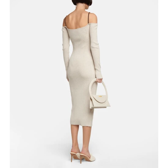 Update your occasion wear edit with Jacquemus’ La Robe Sierra ribbed-knit midi dress. Inspired by classic lingerie detailing, the long-sleeve style features an off-shoulder silhouette with caged straps showcasing the labelโs signature logo.