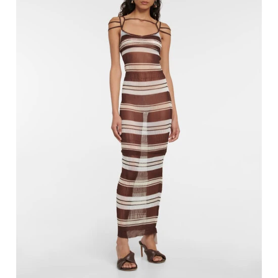 Jacquemus’ La Robe Sognu maxi dress is made from sheer ribbed-knit fabrication. This striped design has a fitted silhouette and an intricate strappy neckline.
