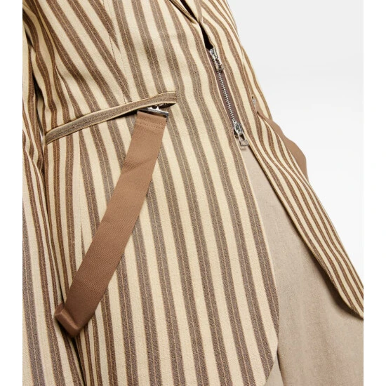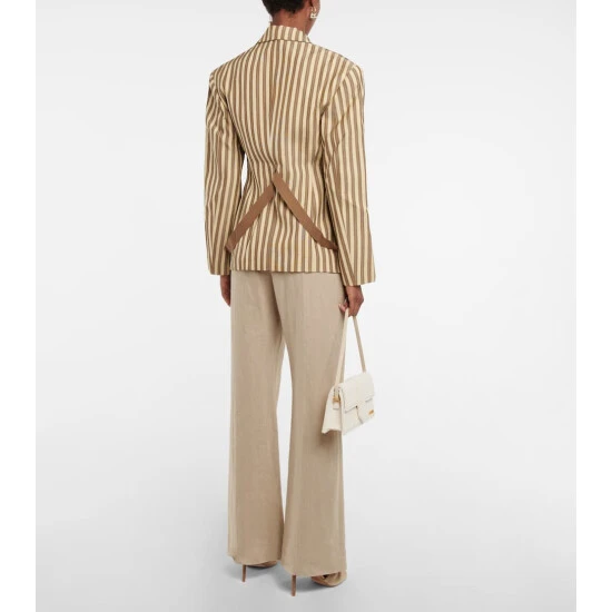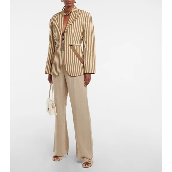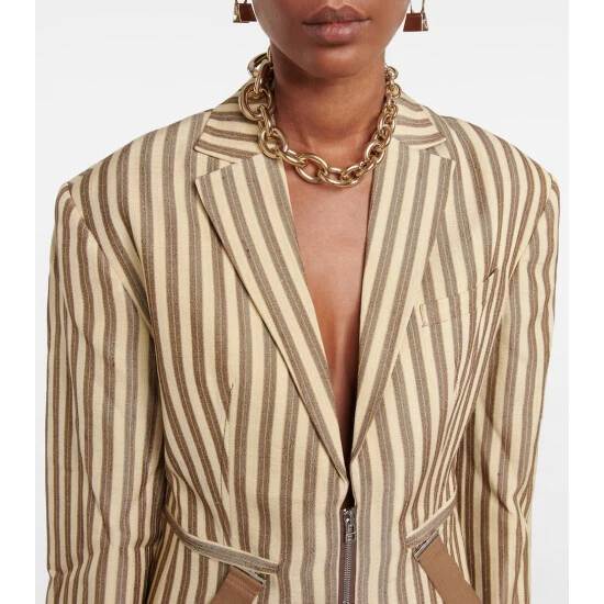 Jacquemus reimagines the classic blazer silhouette with La Veste Filu. Designed for a slim fit, it features beige-and-brown stripes, zipper closures, and a grosgrain belt that starts at the pockets and extends into the interior.