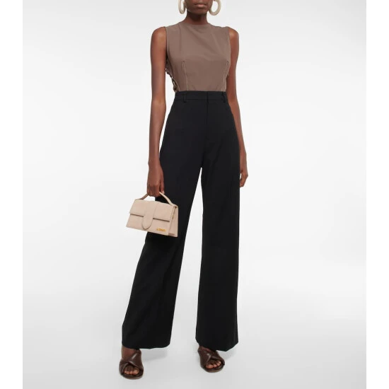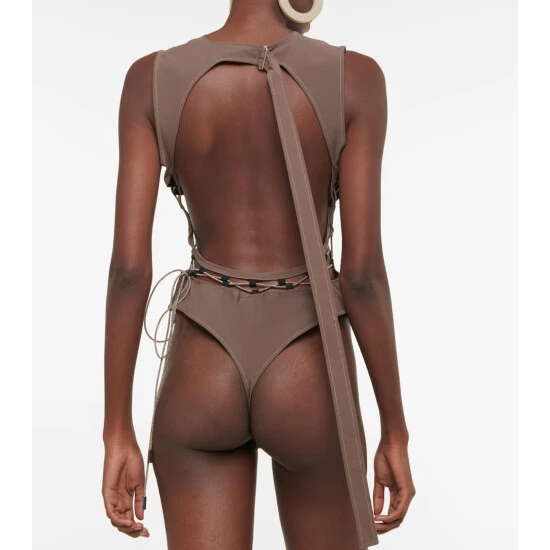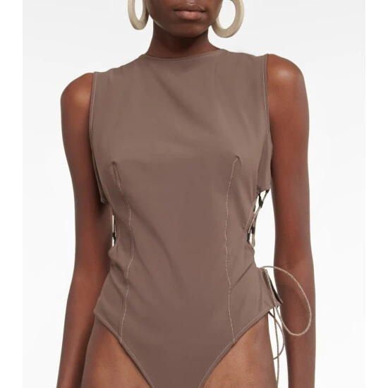 Jacquemusβ Le Body Marrone bodysuit is shaped with elasticated drawstring laces that weave through cutout detailing at the sides and lower open back. Itβs designed to sculpt the body with high-cut legs and an adjustable strap at the neck.