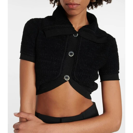 Jacquemus’ Le Cardigan Campana crop top is a cardigan-inspired design with a wide polo collar. It has a buttoned front and a plush chenille look.