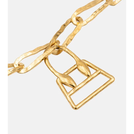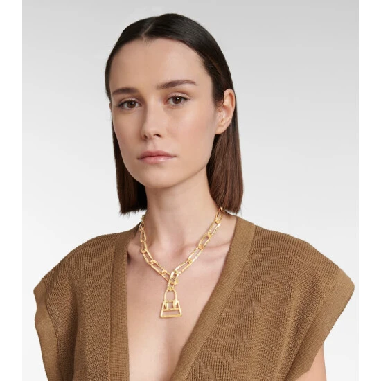 Adorned with a micro replica of Jacquemus’ iconic Chiquito mini bag, the Chiquita necklace makes for a subtle way to ascribe to the label’s insouciance. Made from gold-plated brass, this design is set on a chunky chain with a lobster-clasp fastening.