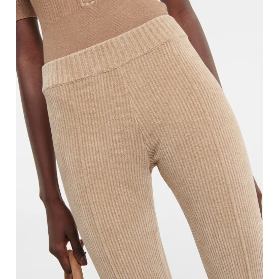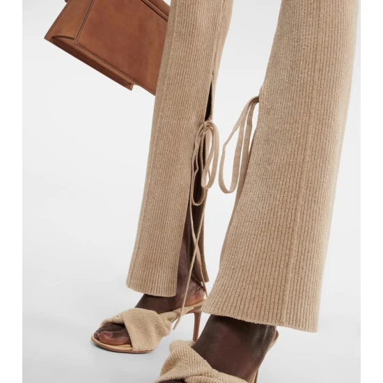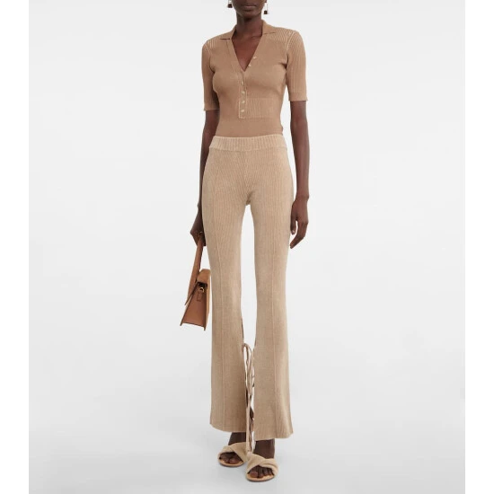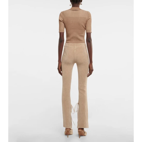 Featuring slits at the side, fastened with ties that wrap around the legs, the Le Pantalon Duci pants from Jacquemus have a unique design. They’re made from a beige cotton blend ribbed knit and have a flared flit.
