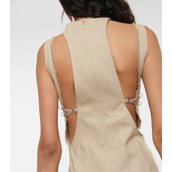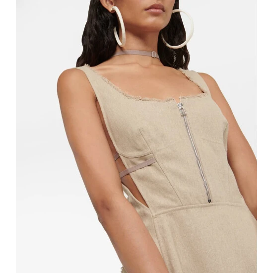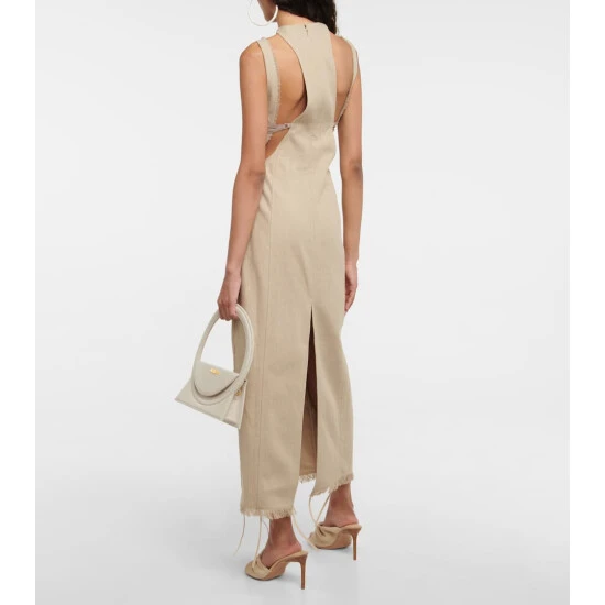 The La Robe Sagiu maxi dress from Jacquemus is a prime example of the brand’s playful and sensual approach. Made from a thick fabric, it features a corset-inspired bodice with cutouts, a racerback, and a fringe-trimmed hem.