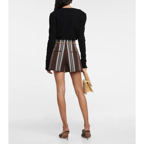 Le Short Santon shorts from Jacquemus are defined by their ultra-high-rise waist and brown stripes. Made from a cotton blend, the leggy style has stitched pleats on the front and a raw hem.