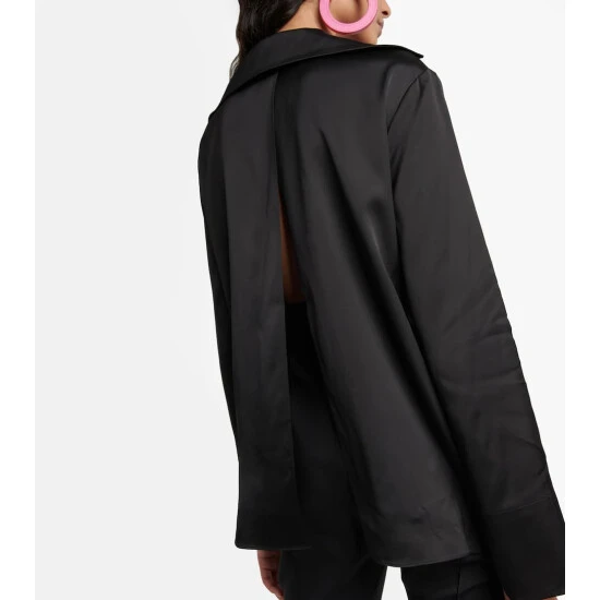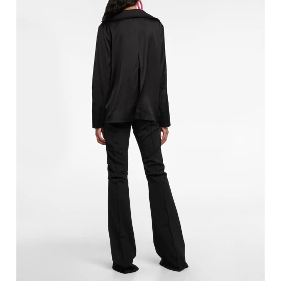 This shirt from Jacquemus is made from smooth satin in a straight-cut with long sleeves and a pointed collar. It features an open front with a sewn-in metal logo charm and a split back.
